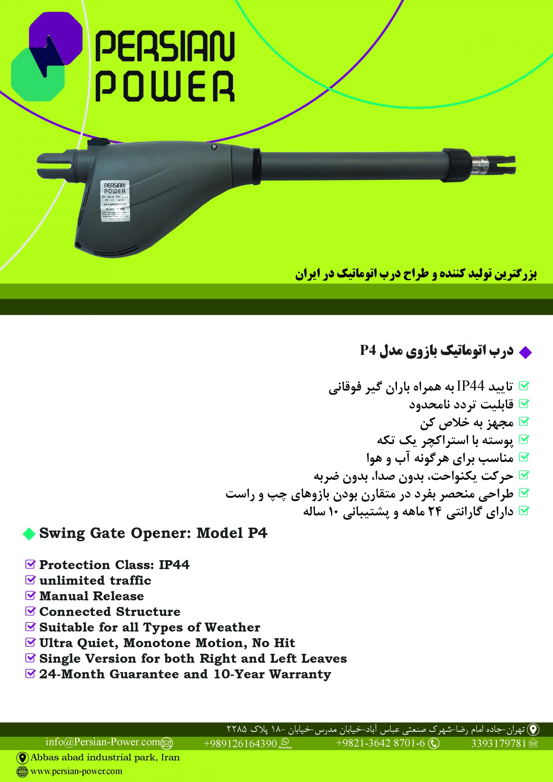 آدرس : تهران – جاده امام رضا – شهرک صنعتی عباس آباد – خیابان مدرس – خیابان 17 الی 18 – پلاک 2284 و 2285   تلفن : 6-02136428701   ایمیل : info@persian-power.com